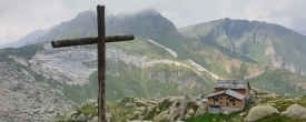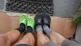 Pour éviter l’averse qui se prépare, nous nous rabattons vers le refuge. La température a soudainement chuté et nous visualisons un chocolat chaud. Nous hésitons un moment car le prix à payer pour pénétrer dans le restaurant est d’ôter ses chaussures et enfiler des crocs. Un coup d’œil supplémentaire sur les pics environnants qui disparaissent sans la brume nous convainc que l’effort à fournir est moindre.