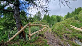 La montée reprend, entre nuages et soleil. Le sentier est en cours d’aménagement. A cet endroit, la piste est à l’aplomb du Fiume d’Orsàira, qui coule une dizaine de mètres plus bas. Rien de tel qu’une belle barrière voyante pour calmer les ardeurs des plus téméraires.