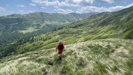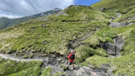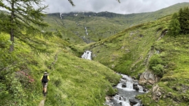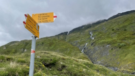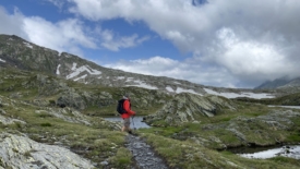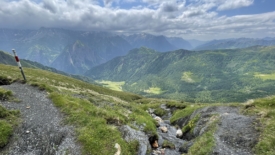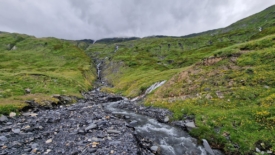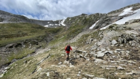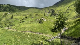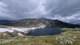 Une journée placée sous une météo changeante qui illustre à merveille le dicton « quand la montagne a son chapeau, mets ta pelisse ou ton manteau ». Partis des hauteurs de Campo, la montée vers le Lago Retico se fait en serpentant dans des prés puis des pentes herbeuses verdoyantes. C’est un ciel couvert qui nous attends à l’arrivée au lac, de même qu’un vent violent et un froid glacial.