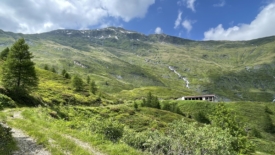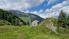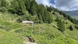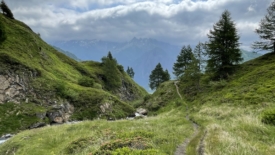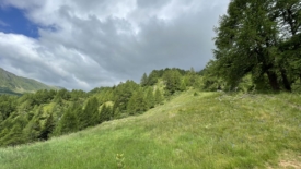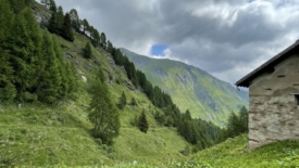 Nous passons de la forêt de mélèzes à des zones herbeuses et traversons même un hameau de maisons de vacances.