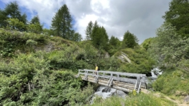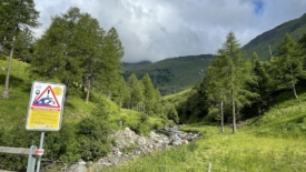 Après avoir traversé le Fiume d’Orsàira, nous partons en direction d’une étable que nous voyons au loin. Un vague sentier y mène, qui semble avoir été « décommissionné », les marques rouges et blanches hâtivement grattées.