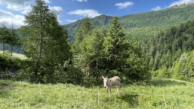 Les prés viennent d’être fauchés, embaumant l’air des senteurs de l’herbe coupée. Un âne solitaire, tenu à l’écart des vaches paissant non loin, s’approche de nous, à la recherche d’un peu de compagnie et d’une caresse. Mais le paysan, posté un peu plus haut, observant son domaine et nous ayant donc forcément repérés, refreine l’enthousiasme de Stefano qui se contentera de l’approcher seulement.