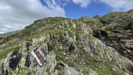 Le sentier marque maintenant le flanc de la montagne. Les pas répétés des randonneurs, peut-être également les sabots des bêtes sauvages ou du bétail, l’eau, profitant du relief et s’engouffrant dans la trace, ont raviné le terrain, y creusant une ride profonde et étroite, quelques fois multiples. Il devient difficile de prévoir la trajectoire et nous nous laissons guider par les peintures rouges et blanches.