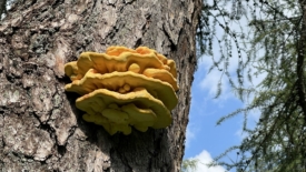 Sur un arbre, un champignon nous arrête un moment. Nous admirons les circonvolutions et sa belle couleur orangée. C’est un Polypore soufré, comestible pour l’homme, mais fatal pour son hôte. Aux Etats-Unis, il porte le nom de chicken of the woods car, à l’état juvénile, son goût et sa texture se rapproche de celui du poulet.