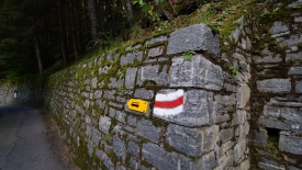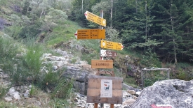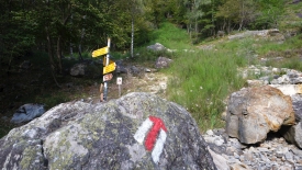 C’est quand même avec soulagement que nous arrivons à l’endroit où le pont enjambe le ri di Tomé. Rigolards, nous ajoutons pour nous-mêmes une légende à la flèche rouge et blanche de la photo ci-dessous : suivez la flèche pour en baver.