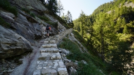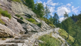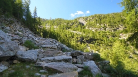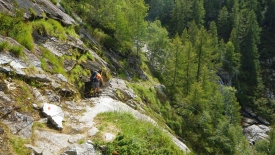 Devant nous, une falaise. A droite, le ri di Tomé. Le sentier se glisse entre la falaise et le torrent et s’habille de marches pour être plus solide.