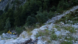 En parlant de travaux, un volute de fumée noire assorti d’un éclat jaune trahit la présence d’un engin. Comme il est plus ou moins sur le sentier, nous attendons que son chauffeur nous ait vu et nous ait fait signe de passer. Sa machine, un ragnetto (petite araignée), est une sorte de bulldozer à chenillettes, équipé de deux longues « pattes » stabilisatrices qui se cramponnent au terrain. Nous le regardons travailler un petit moment, impressionnés par la maîtrise et l’audace du conducteur. Une mauvaise évaluation et c’est la glissade assurée.