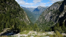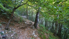 La balade commence très tranquillement. Nous longeons en hauteur la rivière Maggia, restant entre 700 et 750 mètres d’altitude. La forêt est dense et nous ne voyons pas grand chose d’autre que des troncs.