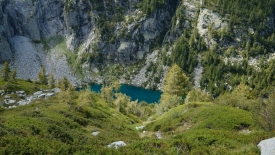 Nous, nous partons voir le lac. Mais de loin. Car le sentier qui y descend ne va pas dans la bonne direction. Et en plus il est bleu et blanc.