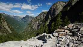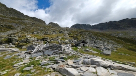L’endroit est joli de par les sommets et les crêtes imposantes qui nous dominent. Un reste de construction gâche un peu le tout, avec ses planches vermoulues hérissées de clous rouillés et des bouts de tôles ondulées jonchant le sol.