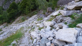 Quelques bouts de murs, assez récents, consolident les abords du sentier. En contrebas le ri di Tomé coule paisiblement. Mais il ne faut pas se fier à l’eau qui dort. Il n’y a qu’à voir les blocs de rochers éparpillés. Et se dire que les travaux en cours qui ne n’ont pas lieu sans raison.