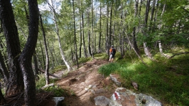 Entre le refuge et la section bétonnée du sentier, le sentier passe entre les mélèzes et les peupliers au tronc blanc.