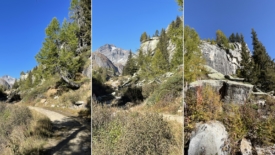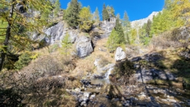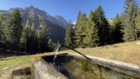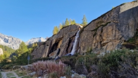 La Cascata del Vannino est toujours à l’ombre mais les mélèzes attrapent la lumière et la restituent partiellement. Nous réalisons qu’aujourd’hui nous n’avons pas vu un seul nuage dans le ciel. Quelle journée !
