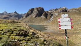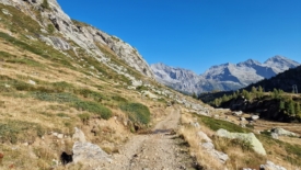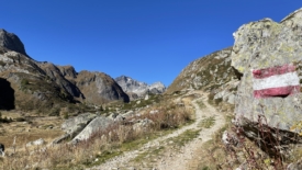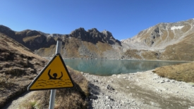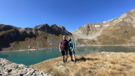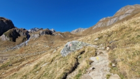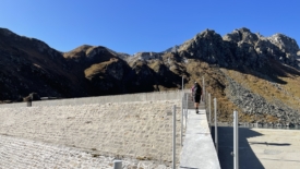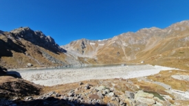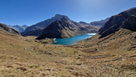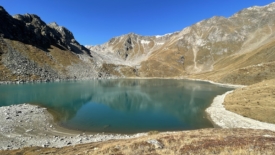 Magnifique journée à la découverte du Lago Vannino. Sa coloration bleu turquoise est amplifiée par la couleur fauve des montagnes qui l’entourent, dépourvues d’arbre, recouvertes de prairie jaune et de rochers. Nous poussons jusqu’au Lago Sruer, un peu plus haut, très photogénique lui-aussi, dont les eaux alimentent le Lago Vannino.