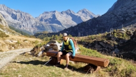 Du coup, j’en profite pour essayer les jolis bancs tout neufs mis à disposition par le CAI Formazza. J’ai de la peine à décider lequel est le plus confortable. En parlant de confort, les plus attentifs auront certainement remarqué mes gants et mon gilet. Depuis que nous avons quitté le Lago Sruer, une bonne brise s’est levée. Comme l’effort à la descente est moindre, j’ai eu tôt fait de me refroidir puis de me couvrir. Devant l’air un peu moqueur de Stefano, j’ai répliqué : ça ne sert à rien d’avoir le sac plein si c’est pour qu’il reste plein ! Pas faux, me répondit-il.