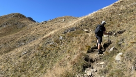 L’option sentier n’étant plus disponible, nous continuons sur la piste carrossable. Elle s’élève assez brusquement sur les flancs de la Cima della Freghera, nous rapprochant d’une seconde zone de falaises à franchir et du Torrente Vannino.