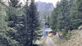 Puis, au détour d’un virage, nous apercevons des câbles qui courent entre les arbres et une structure en béton que nous identifions comme le terminus d’un télésiège. Inattendu, c’est le moins que l’on puisse dire ! Nous n’avons rien vu qui ressemble à une piste de ski, hormis la route.