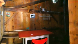 L’intérieur est rustique : une table, un poêle, quelques ustensiles de cuisine et deux lits superposés.