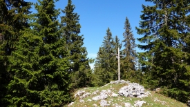 La croix de la Vue de Genève. Nous faisons un petit détour par le point de vue qui se révèle sans intérêt. Le bassin lémanique est brumeux et le jet d’eau éteint, pour éviter que les foules ne s’y agglutinent.
