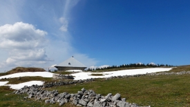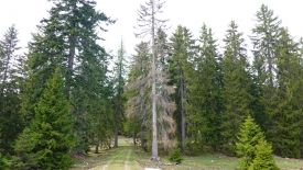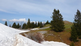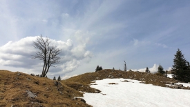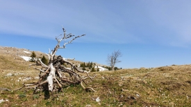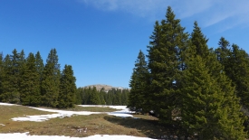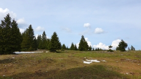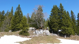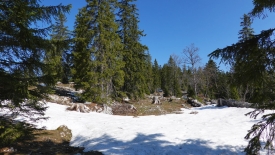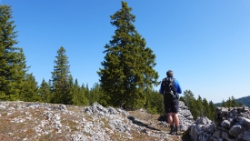 Ici, il faut remarquer trois choses : au fond, le point géodésique du Mont Tendre, au centre, « notre » arbre et à gauche l’arbre à pique nique (pratique pour poser des choses dessus) appelé également arbre à autoportraits.