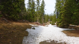 Il ne nous reste plus qu’à zigzaguer entre les plaques de neige. Notre but est là.