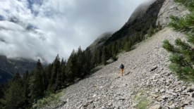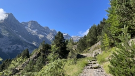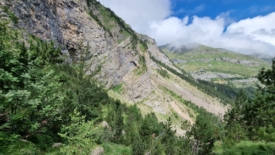 Le chemin se faufile dans la forêt, puis traverse un éboulis, qui en soi ne présente pas de danger. Entre-temps, nous croisons les deux randonneurs que nous avions vu partir sur le sentier : il s’agit du même couple qui nous avait encouragés à aller voir la petite cascade du Gave des Tourettes. Ils reviennent car ils trouvent qu’un passage est très délicat à passer, là où le sentier a été partiellement emporté suite à un éboulement. Nous décidons néanmoins d’aller évaluer par nous-mêmes l’obstacle.