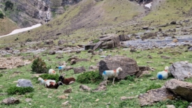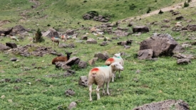 Nous croisons un couple de filles anglophones. Elles nous disent avoir l’intention de s’aventurer sur l’Échelle des Sarradets en baskets, montantes, certes, mais en baskets. Nous les en dissuadons. Nous évoquons les brebis bleu blanc rouge, et elles nous font remarquer en rigolant, que certains moutons sont « tagués » aux couleurs de l’Irlande. Tiens, c’est vrai !