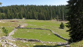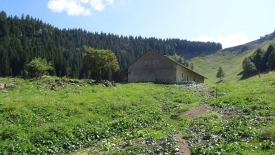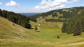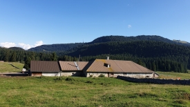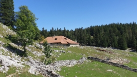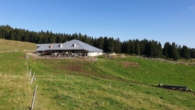 Alors que nous nous éloignons du troupeau (que nous n’avons d’ailleurs pas approché) les deux chiens accourent, en aboyant, très agressivement. Nous nous arrêtons et ne bougeons plus. Un chien mord mon sac à dos. Mon bras aurait été là, ça aurait été pareil. Un gamin est en train de regarder, les rappelant mollement. Alors que nous nous dirigeons vers le chalet (c’est notre itinéraire habituel), il nous annonce « ici c’est privé ». Bon. Stefano ne veut pas d’histoire et nous faisons un détour. Mais la notion de privé dans le Jura n’existe quasiment pas, à part quelques chalets posés sur des terres qui appartiennent aux communes.
