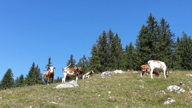 120 génisses paissent dans le pâturage ; il a fallu 5 tracteurs et leur remorque pour monter le bétail. L’hiver, les bêtes sont à Gland, à la ferme Barillier.