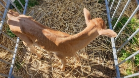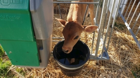 Côté sud, il y a une rangée de maisonnettes pour veau. Deux sont des petits veaux couleur café au lait qui ressemblent presque à des biches.