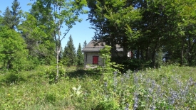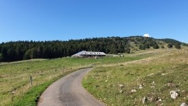 Juste avant d’arriver à la voiture, le chalet de La Givrine, avec, en arrière plan, l’antenne de La Barillette et tout à droite La Dôle.