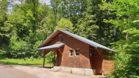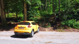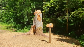 A quelques pas de la voiture, un tronc sculpté. Nous dénombrons six animaux. Il y a ceux que l’on voit, à savoir un écureuil, une renard, un lynx (sur le sommet du tronc). Puis ceux derrière ou sur le côté : un grand-duc, un sanglier, un blaireau et un serpent. Du très très joli travail. Le renard, le blaireau et le grand-duc sont très réussis.