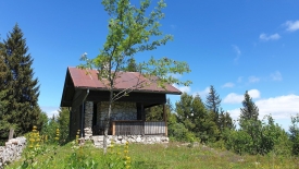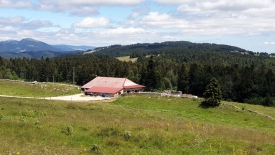 Nous suivons la crête et le mur jusqu’à arriver à la route qui vient du chalet de Pierre. Nous avons décidé de tenter un jus de pomme à la Buvette du Mont Tendre. Nous salivons déjà à l’idée du verre de 5 déci rempli d’un beau liquide ambré.