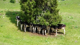 Avant d’arriver au pré Anselme des vaches ont envahi le sentier. Nous les observons avec admiration grimper sur les rochers, se faufilant entre les arbres.