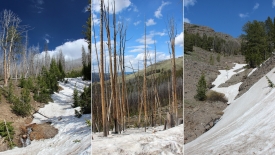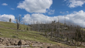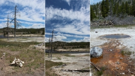 Nous retrouvons la Firehole River, des arbres morts et un ciel tourmenté.