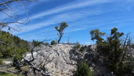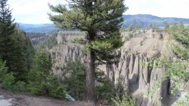 Une première rangée de colonnes en basalte marque la montagne. Puis, dessous, des formations très caractéristiques, des needles. Et au milieu un arbre. À quand les tronçonneuses portatives que l’on glisse discrètement dans la poche ?