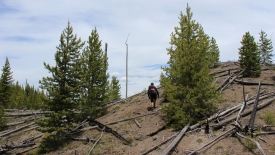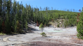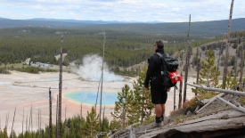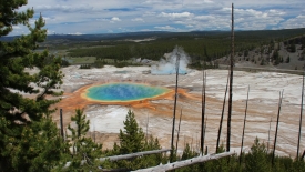 Comme il n’y a pas de sentier officiel, une, puis deux puis trois traces montent en direction de la colline. C’est un peu l’anarchie. La pente est raide, et des arbres morts jonchent le terrain. Très vite, le Grand Prismatic s’offre à nous. Il faut cependant trouver une ouverture parmi les arbres debout, vivants ou mort.