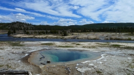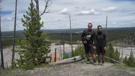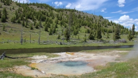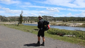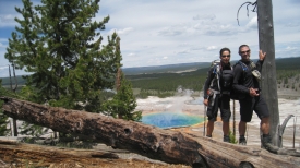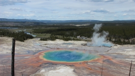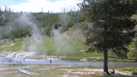 Nous arrivons bientôt en vue du Grand Prismatic. Mais étant au même niveau que lui, nous ne voyons que quelques volutes de vapeur d’eau et des couleurs très pales.