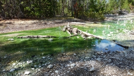 Hier, en roulant, un ruisseau d’un vert éclatant avait attiré mon regard. Nous parvenons à le localiser.