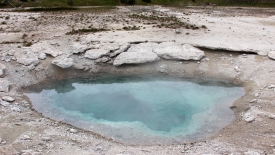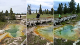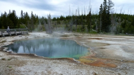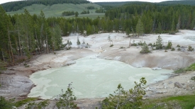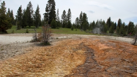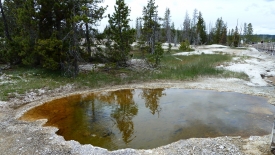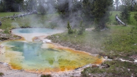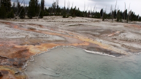 Et voici la star de Yellowstone. Non pas par sa beauté (bof bof) mais par son acidité. C’est le pH le plus bas de toutes les hot springs. 1.3, à peine plus élevé que l’acide de batterie. Le plus incroyable est que des micro-organismes y vivent.