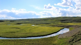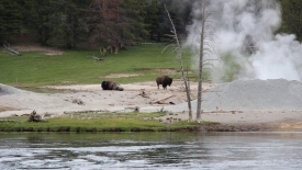 De l’autre côté de la rivière, nous apercevons des bisons, à proximité de fumerolles.