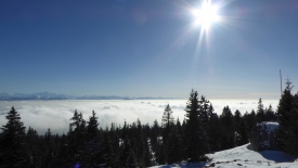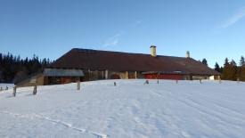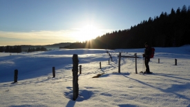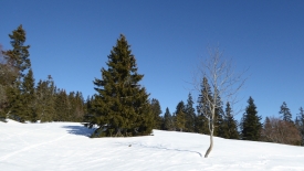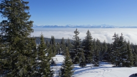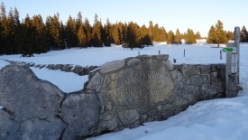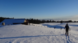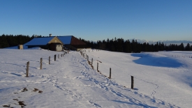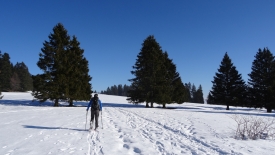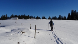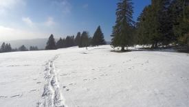 Sans surprise, nous prenons la route du Marchairuz car c’est un peu un des seuls endroits où nous sommes certains de trouver de la neige après une semaine encore de douceur. Nous nous arrêtons au parking du Sapin à Siméon.