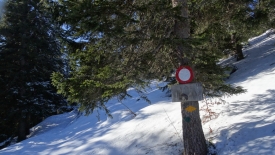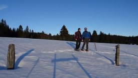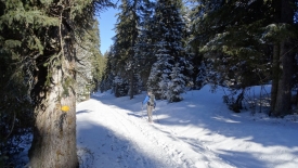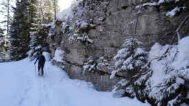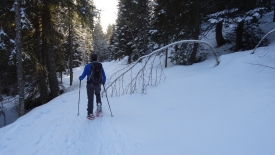Nous retrouvons les sentiers fréquentés. Les premières traces de raquettes faites dans la neige fraîche, avant Noël, sont encore bien visibles et profondes.