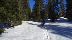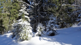 Nous obliquons vers l’est, en suivant une route forestière qui descend tout gentiment. La neige est douce, les températures clémentes et la vie est belle.