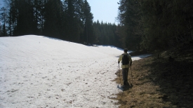 Nous longeons les plaques de neige pour éviter de nous enfoncer jusqu’aux genoux !