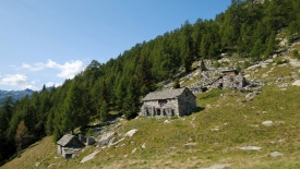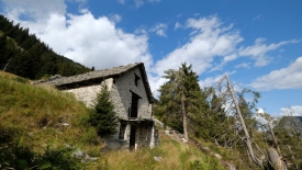 L’alpage Corte Bisavo est un poil plus plat. Deux constructions ménagent un passage étroit entre elles. Alors que nous discutons de l’état des bâtisses, une porte s’ouvre et une femme en sort. Les cheveux longs commençant à grisonner, le visage rond, elle est vêtu de pièces et de morceaux : un tee-shirt trop large et informe, un pantalon au dessus duquel elle a enfilé un short, et des Crocs. Bref, tout ce qu’il faut pour être à l’aise chez soi. Sans chichi. Nous saluons et la conversation va bon train. Commencée en italien, elle se poursuit très vite en lombard. Nous apprenons ainsi qu’elle est née dans la même clinique que Stefano, à la Clinica Sant’Anna, à Sorengo. Que le monde est petit ! Je ne comprends pas tout mais cette dame incarne la gentillesse même. Ses quatorze vaches paissent plus haut. Nous imaginons donc qu’elle monte tous les jours les compter. Elle nous raconte des anecdotes sur la vie paysanne et des souvenirs de vie. Nous pourrions rester des heures à l’écouter.