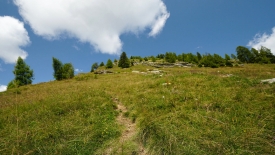 Je regarde vers le haut. Le sentier se perd dans un pré. Le pourcentage de pente est toujours supérieur à 50% sauf qu’il n’y a pas de zigzag.