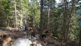 A cela s’ajoute de longs passages quasiment impraticables, conséquence des travaux forestiers en cours, en vue de libérer le sentier des arbres tombés suite aux intempéries de cet été. Des branches sont entassées sur le chemin et ne demandent qu’une seule chose : faire trébucher le randonneur, même prudent. Nous avançons donc très lentement.