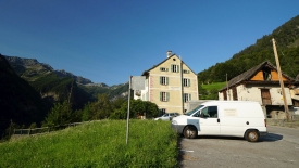 Cerentino et son parking public. Nous nous préparons tranquillement, appréciant le ciel bleu et la belle lumière. Un mini bus postal passe. Sa taille réduite ne nous surprend guère, vue l’étroitesse de la route. Quelque minutes plus tard passe le car postal. Grand comme un… car postal. Raté. Notre théorie s’effondre. Nous apprendrons plus tard que le car postal relie Cevio à Bosco Gurin, alors que le mini bus dessert uniquement les villages de la Valle Rovana.