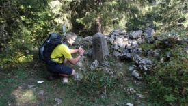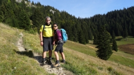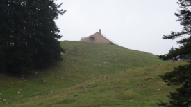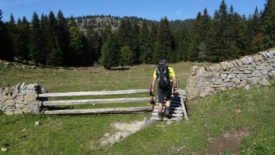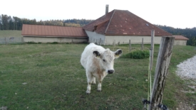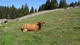 Nous arrivons en vue du Haut Mont. Deux souvenirs resurgissent. D’abord, celui d’un pique-nique écourté : nous nous étions fait encercler par des vaches, qui sans être vraiment menaçantes, nous avaient bien fait comprendre que nous étions sur leur territoire. Ensuite, dans la descente qui mène au chalet, Stefano avait été adopté par un petit âne gris qu’il a fallu raisonner pour qu’il le laisse partir.